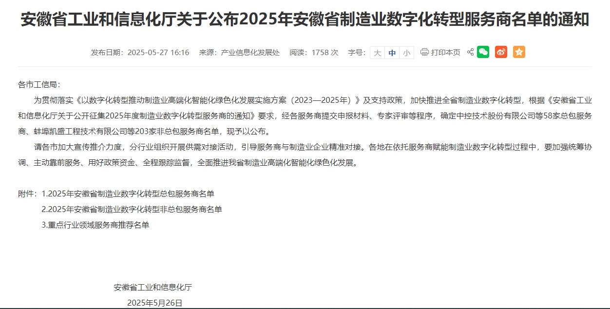 為加快推進(jìn)制造業(yè)數(shù)字化轉(zhuǎn)型,安徽省工業(yè)和信息化廳開展了2025年度制造業(yè)數(shù)字化轉(zhuǎn)型服務(wù)商遴選工作,武漢同捷信息技術(shù)有限公司(以下簡稱“我司”),經(jīng)自薦、專家評審等程序,憑借自身強(qiáng)大技術(shù)實力、服務(wù)能力以及行業(yè)經(jīng)驗,于近日,成功入選2025年安徽省制造業(yè)數(shù)字化轉(zhuǎn)型重點行業(yè)服務(wù)商推薦名單及非總包服務(wù)商名單。